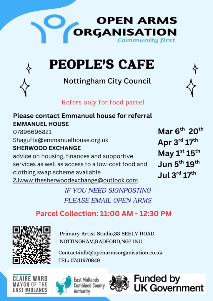 The Open Arms Organisation invites you to the People’s Cafe for a free Food Parcel Collection Event, part of the Nottingham City Council UKSPF Winter Support initiative.